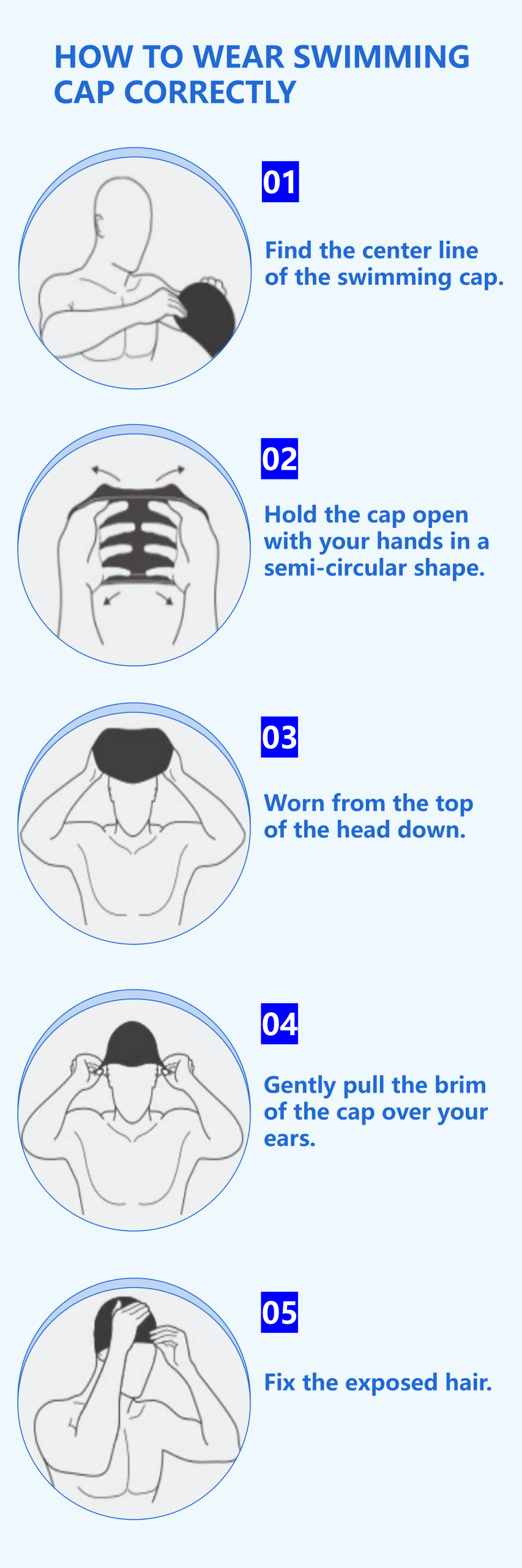 Find the center line of the swimming cap; Hold the cap open with your hands in a semi-circular shape; Worn from the top of the head down; Gently pull the brim of the cap over your ears; Fix the exposed hair. Post time: 4 月-19-2026